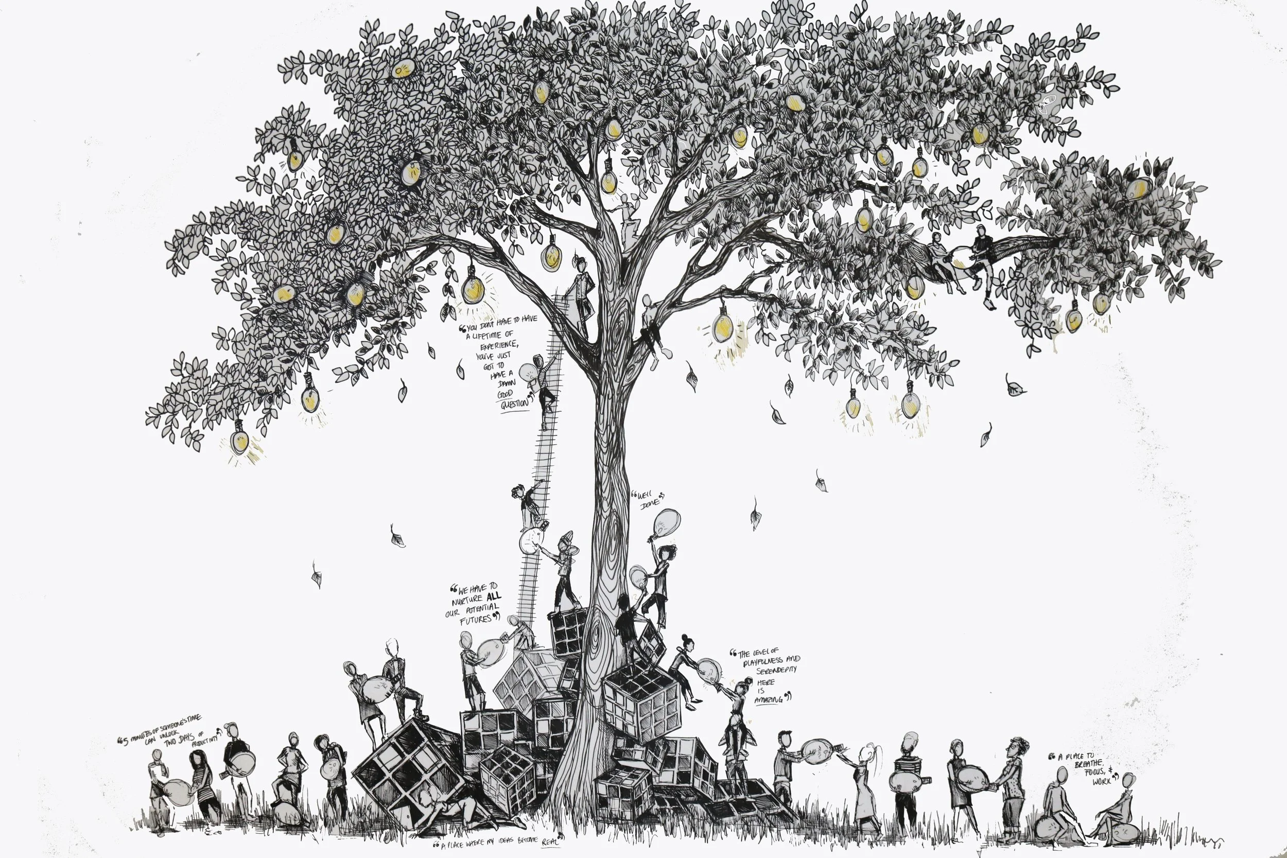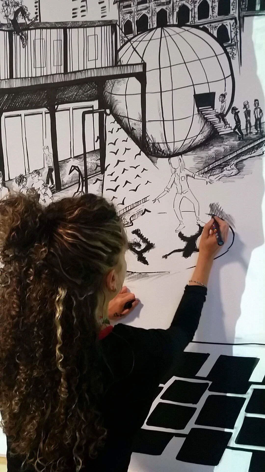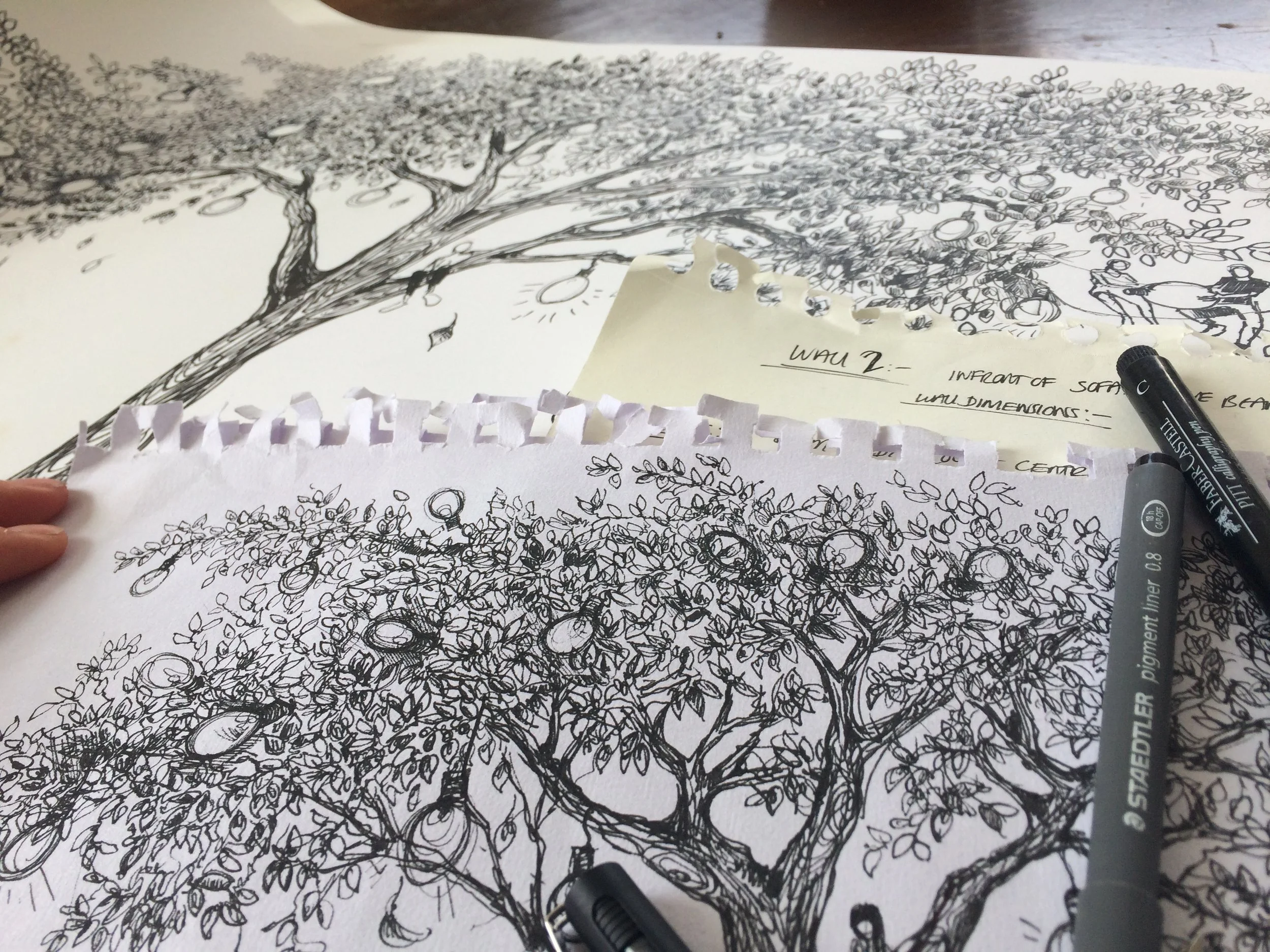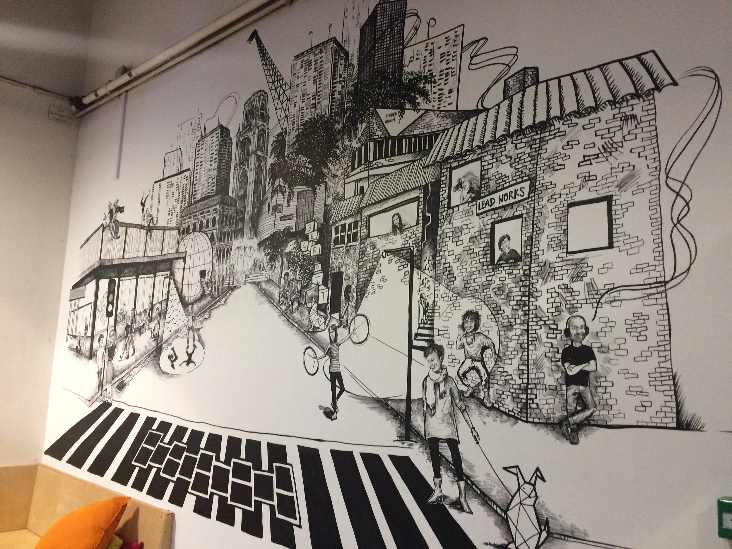 In the summer of 2017, I was commissioned by Watershed to create a mural in the Pervasive Media Studio. The brief was to create something that told the stories of the residents and their projects, bringing to life the studio and the magic that happens within it. I created three walls; first of which depicts the studio's connection with Bristol. The second focusses more on the projects themselves, and the third is around the theme of conversations. Conversations which take place between residents that help nurture and build a creative idea.